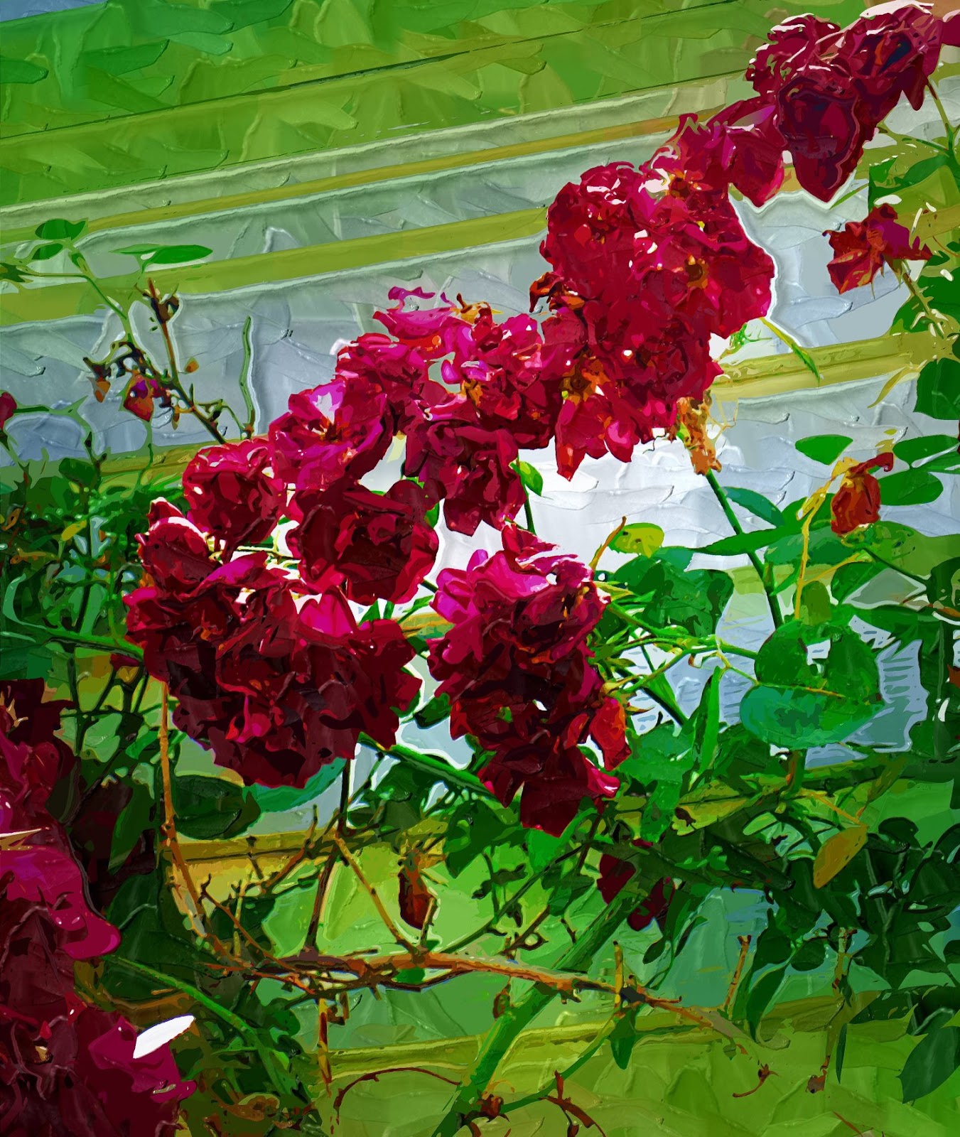Every year I do a digital painting of the roses that my mother planted back in the 1970s. They bloom every spring and then quickly disappear until the next year. Here is this year’s painting. To see it larger, click HERE.
